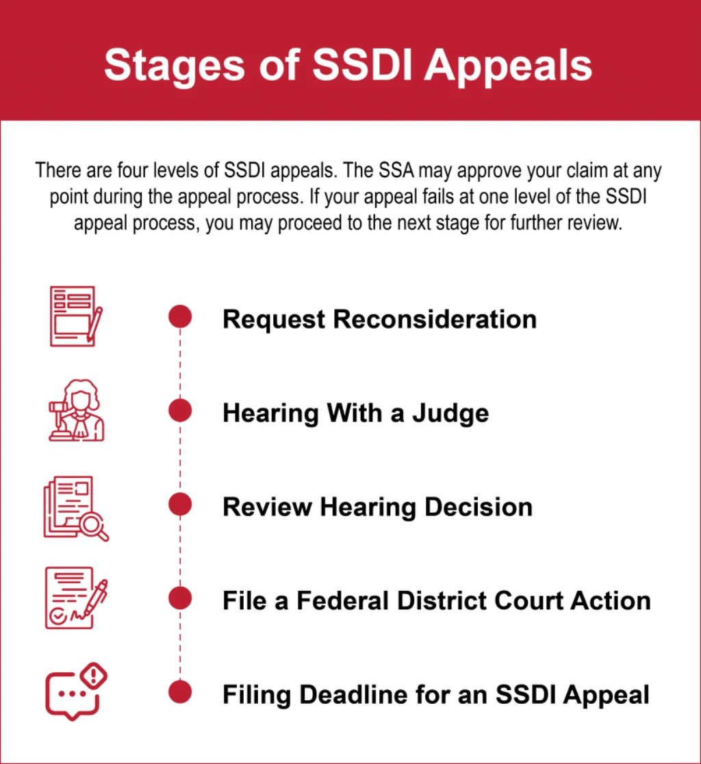 There are four levels of SSDI appeals. The SSA may approve your claim at any point during the appeal process. If your appeal fails at one level of the SSDI appeal process, you may proceed to the next stage for further review.