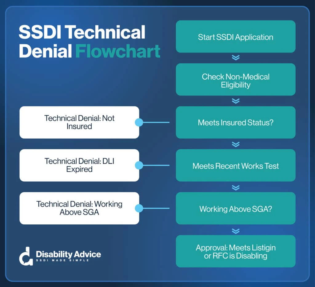A technical denial by the Social Security Administration (SSA) for a Social Security Disability Insurance (SSDI) claim means that the claim is denied without reviewing the claimant’s medical evidence. Instead, it is denied because the applicant does not meet one or more non-medical eligibility requirements.