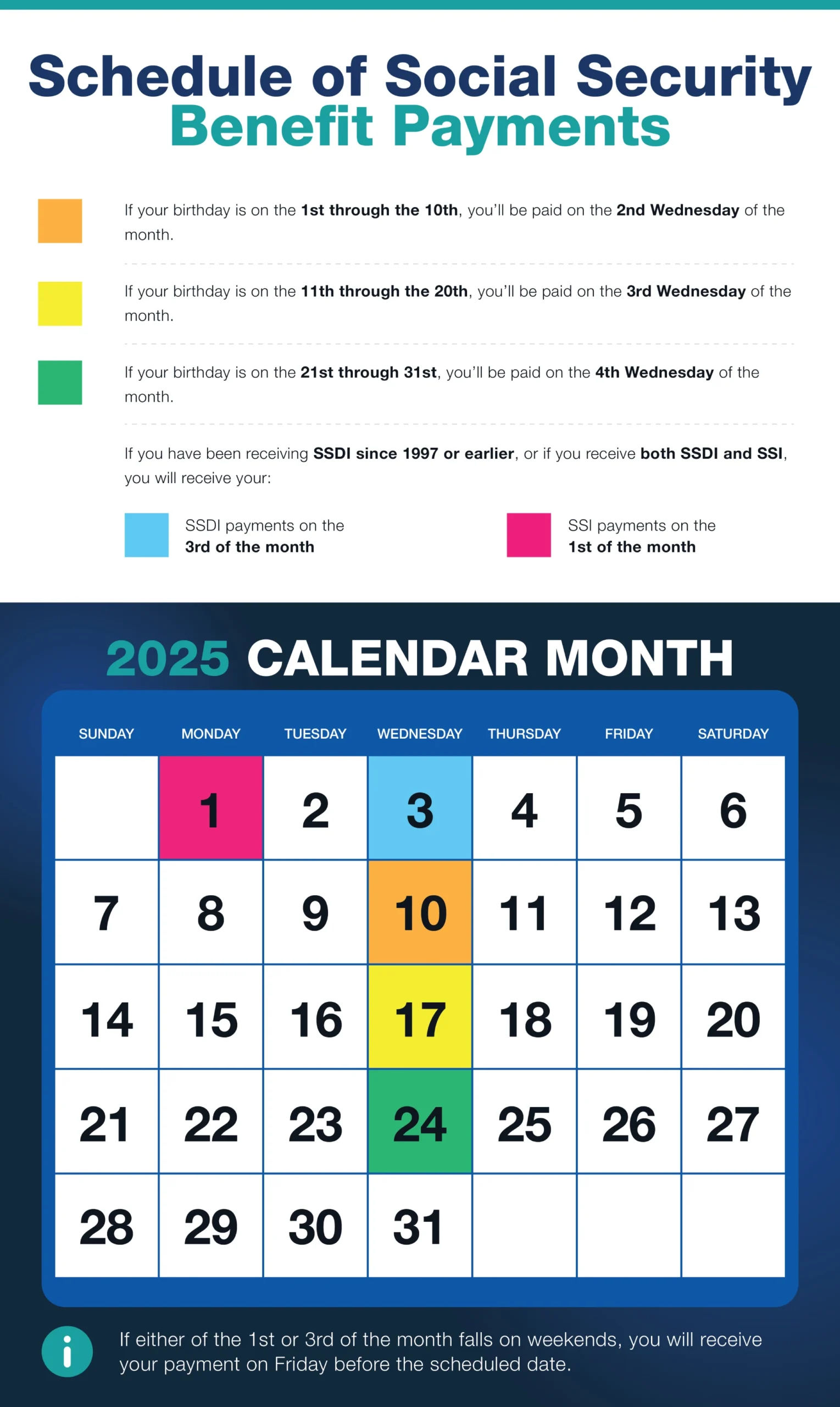 The Social Security Administration disburses monthly SSDI payments to approved individuals, with the payments either directly being deposited into your bank account Direct Deposit or Direct Express® Debit Mastercard. The 2025 pay schedule follows last year’s, with benefits paid on different Wednesdays of the month based on the recipient’s birthday.